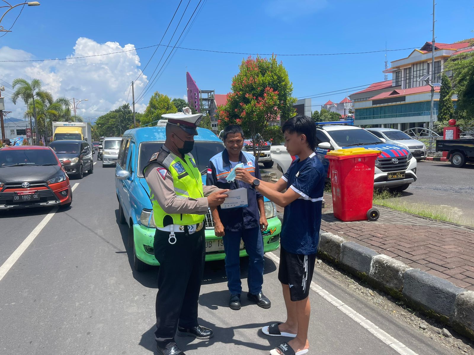 Sambil memberikan edukasi, petugas juga membagikan masker gratis. Bahkan petugas tak segan-segan memakaikan masker kepada pengemudi dan penumpang ranmor.